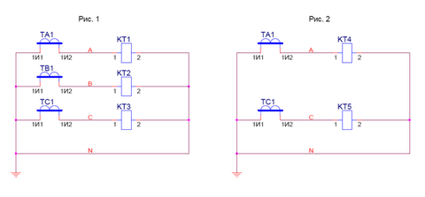 В случае установки в три фазы вторичные обмотки трансформаторов тока соединяются в "звезду" (рис.1), в случае двух фаз - "неполную звезду" (рис.2). Для дифференциальных защит трансформаторов с электромеханическими реле трансформаторы подключают по схеме "треугольника"
