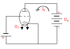 Если на сетку подаётся положительный потенциал относительно катода (рис.9), то значительная часть электронов пролетает от катода к аноду, и в цепи анода существует электрический ток. При подаче на сетку отрицательного потенциала относительно катода электрическое поле между сеткой и катодом препятствует движению электронов от катода к аноду (рис.10), анодный ток убывает. Таким образом, изменяя напряжение между сеткой и катодом, можно регулировать силу тока в цепи анода, что и послужило причиной названия сетки управляющей.