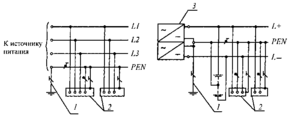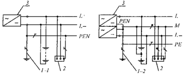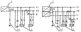 1 - заземлитель нейтрали источника переменного тока; 1-1 - заземлитель вывода источника постоянного тока; 1-2 - заземлитель средней точки источника постоянного тока; 2 - открытые проводящие части; 3 - источник питания