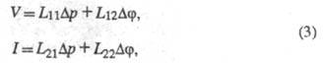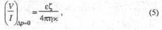 где кинетические коэффициенты L11, L12, L2l и L22 характеризуют соответствующие гидродинамическую проницаемость мембраны, скорость электроосмотического течения, ток течения и удельную электропроводность электролита в мембране. Кинетические коэффициенты удовлетворяют соотношению Онсагера: L12 = L2l. Уравнения (3) и соотношения Онсагера устанавливают простую связь между электроосмосом и потенциалом течения: