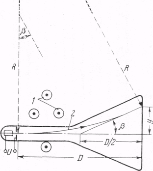 С помощью равенства (7) можно рассчитать то отклонение у, которое испытывает электродный луч в трубке Брауна при действии магнитного поля (например, магнитного поля земли). Как видно из рис. 4, для малых отклоняющих углов (малые у) справедливо соотношение