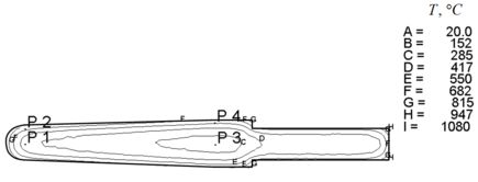 На рис.5.9 показано температурное поле оправки малого диаметра в первом цикле прошивки при еще не установившемся режиме термоциклического нагружения. В контрольных точках P1 - P5, обозначенных на рисунке, фиксируются значения температур и средних напряжений. Максимальное зафиксированное значение температуры составляет