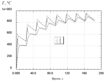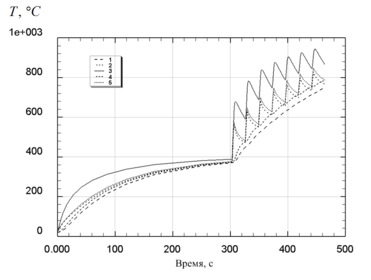Рис.5.7. График изменения температур в контрольных точках при предварительном подогреве оправки в течение 300 с и последующей работе оправки в циклическом режиме нагрев - охлаждение на воздухе.
