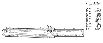 На рисунке 5.10 показано поле средних температурных напряжений, возникающих в оправке малого диаметра в начале процесса прошивки при еще не установившемся режиме. Как видно из рисунка, наблюдается поле напряжений, схожее с рис.5.2, но с поправкой на новую геометрическую форму оправки.