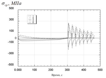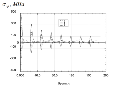 Рис.5.8. График изменения средних температурных напряжений в контрольных точках при предварительном подогреве оправки в течение 300 с и последующей работе оправки в циклическом режиме нагрев - охлаждение на воздухе.