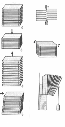 Среди деформаций, возникающих в твёрдых телах, можно выделить пять основных видов: растяжение, сжатие, сдвиг, кручение и изгиб. Для демонстрации этих видов деформаций можно воспользоваться моделью, состоящей из нескольких пластин, скрепленных пружинами (рис. 2, а). Каждая пластина изображает слой атомов (молекул) в кристаллической решетке, пружины моделируют действие сил связи.