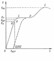 Диаграмма растяжения. Зависимость относительного удлинения образца от приложенного к нему напряжения является одной из важнейших характеристик механических свойств твёрдых тел. Графическое изображение этой зависимости называется диаграммой растяжения. По оси ординат откладывается механическое напряжение σ, приложенное к образцу, а по оси абсцисс – относительное удлинение ε (рис. 6).