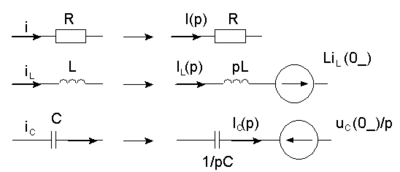 Анализ полученных выражений позволяет раз и навсегда нарисовать операторные схемы замещения элементов, из которых можно строить операторную схему замещения всей послекоммутационной схемы.