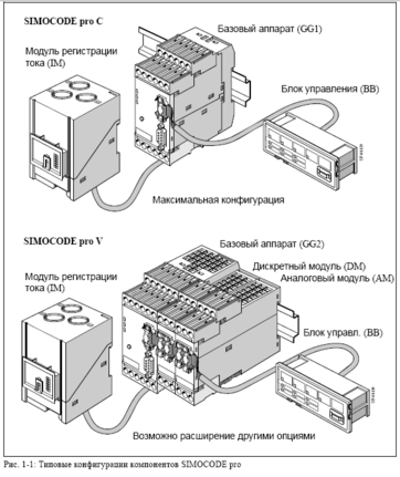 Приводимая схема иллюстрирует типовые конфигурации компонентов SIMOCODE pro C и SIMOCODE pro V: