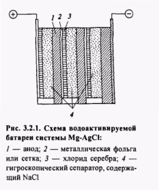 азработаны и используются батареи биполярной и монополярной конструкций. Монополярные элементы соединяются проволочными или фольговыми токоотводами. Биполярные электроды соединяются слоем графита и связующего, нанесенного на магниевый анод или на сшивку из медной проволоки (в ХИТ с хлоридом меди). В батареях повышенного напряжения биполярной конструкции возникают токи утечки. Однако из-за относительно невысокой электрической проводимости электролита (для морской воды 2,9 См/м при О °С и 5,85 См/м при 30 °С) токи утечки в водоактивируемых ХИТ обычно невелики. В батареях, в которых используются электролиты с более высокой проводимостью, распределительные каналы между элементами имеют высокое электрическое сопротивление, существуют также другие способы снижения токов утечки.