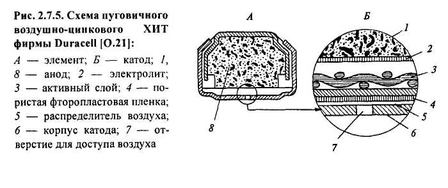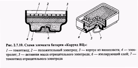 оздушно-марганцево-цинковые ХИТ. Схема конструкции одного элемента из батареи "Корунд ВЦ" приведена на рис.2.7.10 [2.7.3]. Элемент размещается в винипластовом корпусе 3, нижняя часть которого содержит отрицательный электрод 5. Активная масса анода состоит из цинкового порошка, электролита и ингибитора коррозии. Цинковый порошок имеет высокую чистоту (см. § 2.3.3).