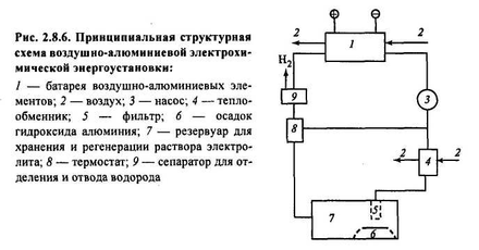 лектролитом является раствор КОН (6-8 моль/л), в который некоторые фирмы добавляют ингибитор коррозии, например станнит натрия. В большинстве ХИТ используется принцип механической замены анодов, в некоторых ХИТ периодически заменяется раствор электролита. Конструкции этих ХИТ относительно мало отличаются от рассмотренных ранее конструкций ХИТ с солевым электролитом. Сложнее устроены ХИТ, имеющие контуры циркуляции электролита. Воздушно-алюминиевый ХИТ большой мощности отличается от обычных ХИТ и практически является электрохимической энергоустановкой (рис.2.8.6). Раствор электролита с помощью насоса 3 поступает из батареи элементов 1 в теплообменник 4, где охлаждается, а затем в фильтр 5 резервуара раствора 7. Отфильтрованный раствор затем через термостат 8 и сепаратор 9 поступает в батарею элементов. Твердый осадок 6 из фильтра поступает на дно резервуара 7 и оттуда удаляется. В сепараторе 9 из раствора удаляются газы, прежде всего водород. Кроме приведенных на рис.2.8.6 частей, энергоустановка имеет систему автоматики, а также может включать инвертор, пробгазующий постоянный ток в переменный, трансформатор и систему использования выделяемой в элементах теплоты.