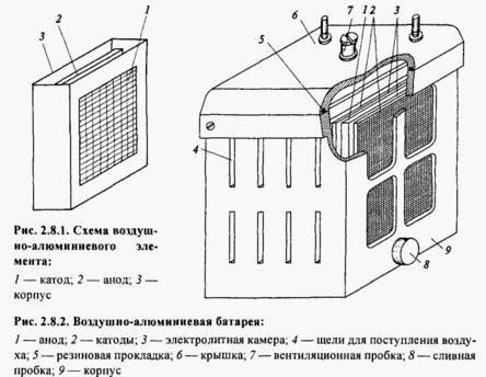 С алюминиевыми анодами и солевыми электролитами. Обычно выпускаются элементы призматической формы. Простейшая схема элемента приведена на рис.2.8.1. Он состоит из алюминиевого или магниевого анода, газодиффузионного воздушного электрода и электролитной камеры. При последовательном или параллельном соединении элементов получают батарею необходимой емкости и напряжения. Батарея имеет корпус с крышкой, к которой прикрепляются токоотводы электродов и в которой имеется клапан для отвода газов. На рис.2.8.2 приведена батарея воздушно-алюминиевых элементов, разработанная в МЭИ (ТУ). Материалом анода служил алюминий, модифицированный небольшими добавками (десятые и сотые массовые доли процента) галлия, олова и свинца. В качестве воздушных применяются двухслойные электроды толщиной 1-1,2 мм. Диффузионный слой состоит из гидрофобизатора (на основе суспензии фторопласта), сажи и металлической сетки. Активный слой содержит активированный уголь и фторопласт. Электролитом служил раствор NaCl (12-15% (по массе)), имеющий удельную электрическую проводимость при 18. °С 140-164 См/м.