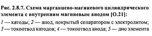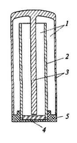 Марганцево-магниевыеХИТ. Производятся марганцево-магниевые ХИТ цилиндрической конфигурации в двух конструктивных формах: обычной и с внутренним анодом. Обычная форма аналогична форме цилиндрических марганцево-цинковых ХИТ с солевым электролитом. Элемент имеет внешний магниевый стакан, являющийся анодом, и внутренний прессованный или полученный экструзией катод с графитовым центральным токоотводом. Элемент снабжен клапаном для отвода газа при повышении давления. Элемент с внутренним анодом (рис.2.8.7) имеет два катода 1 с внешней и внутренней сторон магниевого цилиндрического анода 2. Анод отделяется от катода пористым бумажным сепаратором с раствором электролита. Катодный токоотвод 3 находится как в центре цилиндра, так и образует внешний цилиндр элемента. Элемент помещается в стальной луженый корпус. Магниевый анод содержит небольшие добавки алюминия и цинка. Катод состоит из,% (по массе): ацетиленовой сажи - 10, хромата бария - 3, гидроксила магния (буферная добавка) - 1, диоксида марганца - остальное. На 10 мае. ч. сухого вещества вводят 4 мае. ч. раствора электролита. Электролит содержит 1