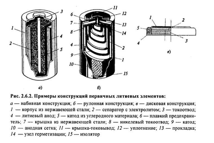 Конструктивные типы литиевых элементов определяются общими правилами: для эксплуатации при повышенных токовых нагрузках предназначаются элементы с тонкими электродами, в основном рулонной конструкции, для получения максимальной удельной энергии используют набивные элементы. Схема устройства рулонных и набивных литиевых элементов показана на рис.2.6.2, а, б, на рис.2.6.2, в - схема конструкции дискового элемента.