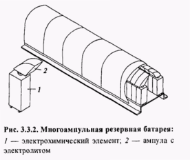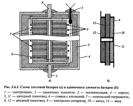 система подогрева для батарей, рассчитанных на работу в условиях отрицательных температур. Эта система выполняется в виде пиротехнических устройств или электрических нагревателей. Известны патенты, предлагающие осуществить подогрев элементов батареи за счет теплоты, выделяемой при химических реакциях, происходящих при разряде батареи.
