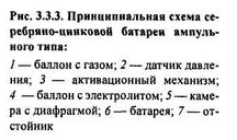 Одноампульные батареи обычно состоят из одного или двух рядов элементов, в которые электролит заливают из одной или двух ампул (рис.3.3.3). Приведение в действие рассматриваемого варианта конструкции осуществляется с помощью сжатого газа, находящегося в специальном баллоне. Сжатый газ может подводиться к батарее и от внешнего магистрального трубопровода. Он поступает в баллон с электролитом и вытесняет его в элементы батареи, при этом разделительная диафрагма прорывается острым ножом. Проход газа в батарею предотвращается растягивающейся эластичной камерой.