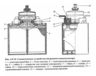 нутренняя полость компенсатора давления заполнена электролитом и сообщена с подкрышечным пространством аккумулятора. При погружении аккумулятора в морскую воду компенсатор под воздействием гидростатического давления сжимается и находящийся в нем электролит перетекает в бак. Объем камеры - компенсатора давления и номинальный объем электролита в камере определяются экспериментально с учетом изменения объема электролита вследствие сжимаемости жидкости; сжатия и растворения газа, имеющегося в порах активных масс и сепараторов; температурных колебаний электролита и изменений объема, связанных с фазовыми превращениями в активных массах. С известным приближением можно принять, что объем камеры VK зависит от объема аккумулятора V: FK = (0,03-0,04) V.