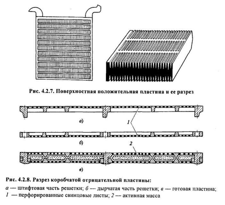 В указанных аккумуляторах используются поверхностные положительные и коробчатые отрицательные пластины (рис.4.2.7. и 4.2.8). Поверхностные пластины отливаются из чистого свинца в виде листов с рифленой поверхностью толщиной до 12 мм. Аккумуляторы изготавливаются в стеклянных, эбонитовых или деревянных, выложенных рольным свинцом, баках. Поверхностно-коробчатые аккумуляторы имеют открытое исполнение. Несмотря на большой срок службы, поверхностно-коробчатые аккумуляторы имеют существенные недостатки. Расход свинца для этих аккумуляторов, например СК-1, СК-5, СК-24, составляет 0,10 - 0,13 кг/(А ч), в то время как для аккумуляторов с намазными электродами эта величина не превышает 0,08 кг/(А ч). Открытое исполнение не позволяет размещать поверхностно-коробчатые аккумуляторы вблизи от аппаратуры.