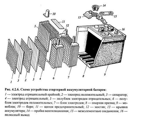 Стартерные батареи. Конструкция и параметры. Конструктивно стартерные АБ различаются незначительно. Схема их устройства представлена на рис.4.2.6. Современные стартерные АБ изготовляются в эбонитовых или пластмассовых моноблоках. В качестве материала пластмассовых моноблоков используются полиэтилен, полипропилен, блоксополимер этилена с пропиленом. Блоки электродов в современных АБ соединяются между собой через стенки моноблока. Массогабаритные показатели стартерных батарей емкостью 55 А ч, изготовляемых рядом ведущих фирм мира. Кроме электрических и