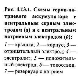 Большинство разработчиков используют конструкцию аккумулятора с центральным натриевым электродом (см. рис.4.13.1, б). В этом случае сера находится в кольце между электролитом и корпусом. Для повышения безопасности работы камеру натриевого электрода заполняют пористыми веществами из керамики, стекла или металла. Для герметизации аккумуляторов применяется ос-А1203.