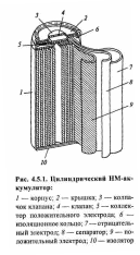 аибольшее распространение среди НМ-аккумуляторов нашли аккумуляторы цилиндрической формы. Положительный и отрицательный электроды, разделенные сепаратором, скручены в виде рулона, который вставлен в корпус и закрыт герметизирующей крышкой с прокладкой (рис.4.5.1). Крышка имеет предохранительный клапан, срабатывающий при давлении 2-4 МПа в случае неправильной эксплуатации аккумулятора. Малогабаритные цилиндрические аккумуляторы небольшой мощности выпускаются и с ламельной конструкцией электродов.