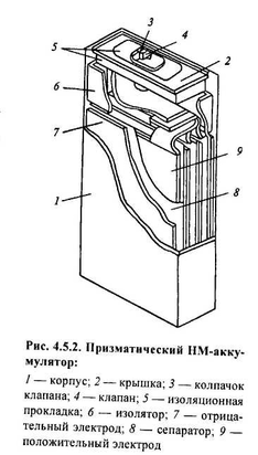 В призматических НМ-аккумуляторах (рис.4.5.2) положительные и отрицательные электроды расположены поочередно, а между ними располагается сепаратор. Блок электродов вставлен в металлический или пластмассовый корпус и закрыт герметизирующей крышкой. На крышке обычно устанавливается клапан или датчик давления.