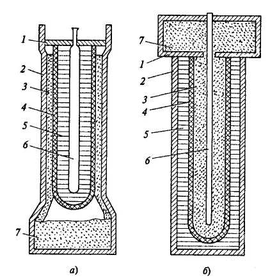 ерно-натриевые аккумуляторы. Большинство аккумуляторов имеет трубчатую конструкцию. Применение дисковых и других плоских электролитов связано с большими трудностями герметизации аккумуляторов. Используются две разновидности трубчатых аккумуляторов (рис.4.13.1). В одной из них внутри трубчатого электролита находится натриевый электрод (рис.4.13.1, б), в другой - серный электрод (рис.4.13.1, а). Применение центрального серного электрода упрощает решение антикоррозионных задач. В одном из вариантов аккумулятора трубки электролита длиной 0,3 м с толщиной стенки 1,8 - 10~3 м и внешним диаметром 3,3 1СГ2 м заполняются графитовым волокном, пропитанным серой. Около электролита графит находится в смеси с глиноземом. Токоотводом служит алюминий, защищенный слоями нихрома и графита. Электролит с центральным серным электродом помещают в трубку (корпус). В кольцевом зазоре между корпусом и электролитом находятся графитовые шарики, промежутки между которыми заполнены натрием. Графитовый заполнитель нужен для уменьшения количества свободного натрия, который может взаимодействовать с серой при образовании трещин или разрушении электролита. Аккумулятор имеет емкость 88 А ч, массу 1,06 кг, удельную энергию при двухчасовом разряде 140-125 Вт-ч/кг.