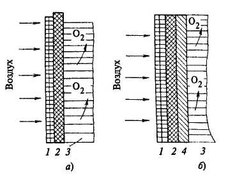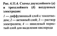 альнейшие работы показали, что более высокую активность и стабильность имеет трехслойный электрод с никелевым слоем, активным в реакции выделения кислорода, средним слоем с катализатором восстановления кислорода (диоксидом марганца, перовскитом или пирополимером) и диффузионным слоем для подвода воздуха (рис.4.11.4, б).