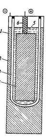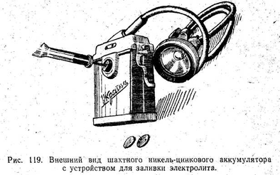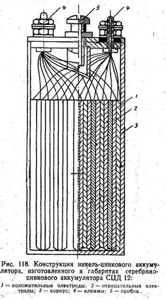 Конструкция никель-цинкового аккумулятора тождественна конструкции серебряно-цинкового аккумулятора (рис.118) Положительные электроды изготовляются обычно по безламельной технологии, отрицательные - из смеси порошка цинка с' окисью цинка. В шахтных аккумуляторах (рис.119) отрицательные электроды изготовляются из Смеси окиси цинка с гидроокисью кальция. Назначение последней - связывать цинк при разряде в нерастворимый цинкат кальция CaZn(OH) 4. Однако необходимый эффект достигается только при использовании в качестве электролита раствора едкого кали небольшой плотности (не более 1,06).