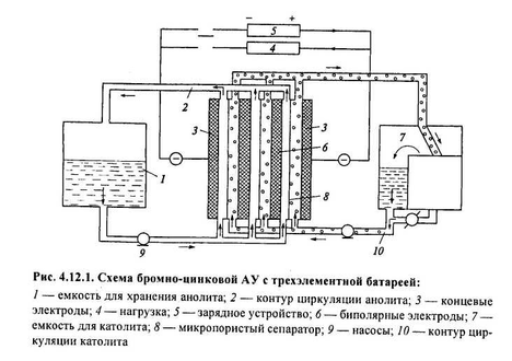 Кроме батареи аккумуляторов АУ включает два контура циркуляции, две емкости для хранения реагентов (рис.4.12.1), а также теплообменник, сепаратор для отделения водорода и систему контроля и автоматики. При последовательном соединении аккумуляторов в батарею возникают токи утечки через каналы подвода и распределения реагентов, которые могут быть снижены путем уменьшения площади сечения подводящих и распределительных каналов, однако при этом возрастают гидравлические сопротивления и потери энергии на прокачку растворов. Поэтому выбирают оптимизированные значения площади сечения подводящих и распределительных каналов. Для снижения токов утечки уменьшают число последовательно соединенных элементов. В качестве конструкционного компонента, устойчивого при контакте с бромом, нашел применение полиэтилен высокого давления, упрочненный стекловолокном.