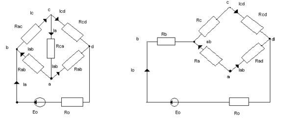 По этой причине работа мощных цепей в согласованном режиме невыгодна. В электрических цепях большой мощности R0< Режим холостого хода (х. х) и короткого замыкания (к. з) – являются предельными режимами работы электрической цепи. В режиме холостого хода ток I=0 (внешняя цепь разомкнута, т.е В режиме короткого замыкания выводы источника соединены между собой накоротко ( Iк.з.=E/R0 (1.1.11) Этот ток может вызвать перегрев источника, или даже его повреждение (т.е. режим короткого замыкания электрической цепи является аварийным). Для защиты источников и питательных цепей от токов короткого замыкания применяются плавкие предохранители, автоматические выключатели и другие защитные аппараты. На рис 1.4 приведены зависимости мощности генератора (источника) P2, напряжение на нагрузке UH, …………….. в нагрузке pH и КПД цепи η от величины тока в нагрузке эти зависимости соответствуют выражениям: Рис 1.4 Закон Ома и законы Кирхгофа для электрических цепей постоянного тока Закон Ома устанавливает связь между электрическим током I, протекающим в цепи, электрическим напряжением U. При анализе работы электрических цепей применяются три формулировки этого закона. Закон Ома для участка цепи : Для пассивного участка цепи по закону Ома Закон Ома для полной цепи: Если пренебречь сопротивлением проводов в схеме замещения простой неразветвлённой цепи рис.1.3 (Ra=0), то ток в цепи: Закон Ома в обобщённой форме: Закон Ома может быть записан и для участка цепи (например её любой ветви)содержащей источник ЭДС, с учётом известной разности потенциалов на концах этого участка рис.1.5. Рис. 1.5 Для этого величина тока определяется выражением: В общем случае произвольного числа источников ЭДС и резисторов это выражение имеет вид: Где ∑E – алгебраическая сумма ЭДС источников; ∑R – суммарное электрическое сопротивление цепи; Первый Закон Кирхгофа Первый и второй законы сформулированы Кирхгофом в 1845 году и являются основными законами определяющими решения электрической цепи. Первый закон Кирхгофа применяется к узлам электрической цепи. Он гласит: алгебраическая сумма токов в узле электрической цепи равно нулю: Для узла и электрической цепи рис. 1.6 этот закон даёт выражение: Рис.1.6 Первый закон описывает тот факт, что заряды одного знака не могут накапливаться в узле. Второй закон Кирхгофа Второй закон Кирхгофа применяется к контурам электрической цепи. Он формулируется следующим образом: алгебраическая сумма падения напряжения на всех сопротивлениях замкнутого контура равна алгебраической сумме ЭДС, входящих (включённых) в этот контур. Где n-число резисторов в контуре, m- число источников ЭДС в контуре. При записи этого выражения (1.18) задаются произвольно направления обхода и все слагаемые Vk, Ek cовпадающие с направлением обхода берутся со знаком плюс, а не совпадающие – со знаком минус. Для контура рис 1.7 это выражение будет иметь вид: Рис. 1.7 Второй закон Кирхгофа описывает тот факт, что при обходе контура и возвращении в конечную точку, потенциал этой точки не мажет измениться, так - как иначе не соблюдался бы закон сохранения энергии. 11 Эквивалентные преобразования пассивных участков электрической цепи В зависимости от назначении электрической цепи, её элементы могут соединяться между собой последовательно, параллельно, последовательно – параллельно (по смешанной схеме), тр