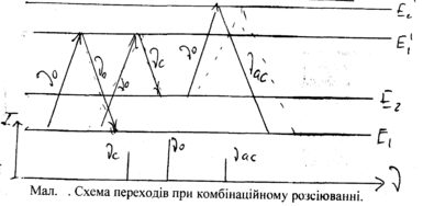 Крім поглинання і випромінювання до радіаційних переходів належать і переходи пов’язані з комбінаційним розсіюванням. Суть цього явища полягає в тому, що будь-яка речовина має властивість частково копіювати радіаційне випромінювання з частотою 0, що падає на неї. Причому серед розсіяних квантів присутні кванти не тільки з частотою 0, але і інших частот с (стоксове) і ас (антистоксове).