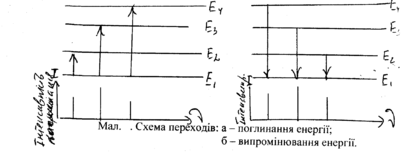Мал. . Схема переходів: а – поглинання енергії; б – випромінювання енергії.