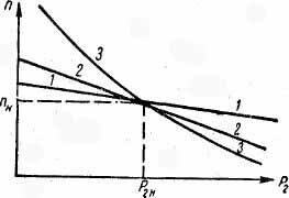 Скоростные характеристики дают зависимость скорости вращения п от полезной мощности Р2 на валу двигателя в случае, если напряжение U сети и сопротивление rв регулировочного реостата цепи возбуждения остаются неизменными, т. е. n=f(P2), при U=const и rв = const.