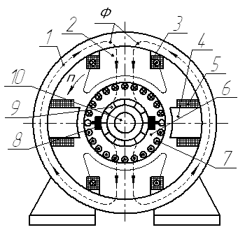 На валу 10 двигателя закреплен цилиндрический магнитопровод 6, в пазах которого расположена обмотка якоря 7. Секции обмотки якоря присоединены к коллектору 9. К нему же прижимаются пружинами неподвижные щетки 8. Закрепленный на валу двигателя коллектор состоит из ряда изолированных от него и друг от друга медных пластин. С помощью коллектора, и щеток осуществляется соединение обмотки якоря с внешней электрической цепью. У двигателей они, кроме того, служат для преобразования постоянного по направлению тока внешней цепи в изменяющийся по направлению ток в проводниках обмотки якоря.