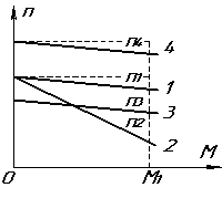 В двигателе последовательного возбуждения вид моментной характеристики приближается к параболическому, так как изменение момента от тока нагрузки происходит, по закону параболы, пока сталь не насыщена. По мере насыщения зависимость приобретает более прямолинейный характер (кривая 4). В компаундном двигателе моментная характеристика (кривая 3) занимает промежуточное положение между характеристиками двигателя параллельного и последовательного возбуждения.