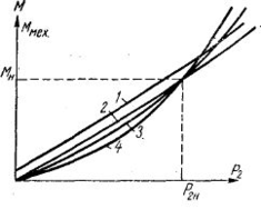 Если скорость вращения двигателя параллельного возбуждения не изменялась бы с нагрузкой, то зависимость момента Ммех от полезной мощности графически представляла бы прямую линию, проходящую через начало координат. В действительности скорость вращения с увеличением нагрузки падает. Поэтому характеристика полезного момента несколько загибается кверху (кривая 2, рис. 4). При этом кривая электромагнитного момента М проходит выше кривой полезного момента Ммех на постоянную величину, равную моменту холостого хода М0 (кривая 1).