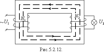 Уперше трансформатор створив 1878 року російський вчений Яблочков, а на початку ХХ ст. його удосконалив професор Усатін і професор Київського університету Доліво-Добровольський. Трансформатор складається із замкненого осердя із феромагнетика, на якому розміщують дві (інколи більше) котушки у вигляді обмоток із дроту. Одну обмотку, яку вмикають у джерело змінної напруги, називають первинною, другу обмотку, до якої приєднують "навантаження", що споживає енергію, називають вторинною (рис.5.2.12):