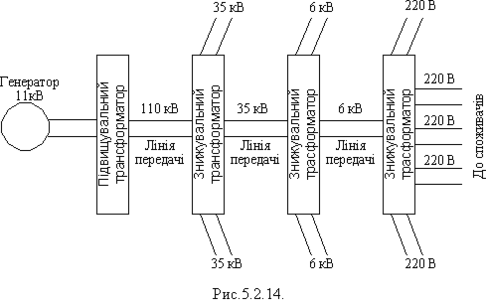 Передавання електроенергії на великі відстані здійснюють за напруг у декілька сотень тисяч вольтів. Генератори потужних електростанцій виробляють струм з напругою від 6 до 20 кВ. Для передавання електроенергії від електростанцій використовують трансформатори для підвищення напруги до декількох сотень кіловольтів. На місцях споживання електроенергії за допомогою трансформаторів напругу зменшують (рис.5.2.14).