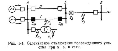 У випадку к. з.(короткого замикання) у точці k2 при селективній дії захисту, повинна відключитися ушкоджена лінія /, лінія // залишається в роботі. При такому відключенні всі споживачі мережі зберігають живлення. Цей приклад показує, що якщо підстанція пов'язана з мережею декількома лініями, то селективне відключення к. з. на одній з ліній дозволяє зберігти безперебійне живлення споживачів.