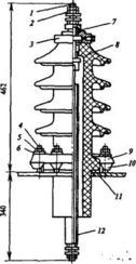 Рис. 1.15. Ввод для наружной установки на напряжение 35 кВ при токе до 250 А с токоведушей шпилькой, присоединяемой к отводу: 1 — медная шпилька; 2 — латунная гайка; 3 — латунный колпак; 4, 5 к 6 — стальные шпилька, гайка, шайба; 7 — резиновое кольцо; 6 — фарфоровый изолятор; 9 — стальной штампованный фланец; 10 — кулачок; 11 — резиновое уплотнение; 12 — токоведущая шпилька с изолирующей трубкой