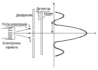 Найбільш наочні експериментальні результати, які підтверджують хвильову природу електронів, отримані в дослідах по дифракції електронів на двох щілинах, виконаних уперше в 1961 р. К. Йенсоном. Ці досліди ― пряма аналогія досліду Юнга для видимого світла. Схема досліду показана на рис. 1.3 а.