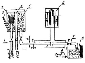 Экспериментальный участок трубопровода круглого сечения длиной L подсоединен к напорному баку 5, в который из водовода через вентиль 1 и успокоительную сетку 3 непрерывно подается вода. Излишки воды из бака сливаются через переливную трубу 4. Поэтому в баке может поддерживаться постоянный уровень. Расход воды через экспериментальный участок регулируется вентилем 7 (вентиль на входе в экспериментальный участок полностью открыт во время всего эксперимента). После прохождения экспериментального участка вода сливается в мерный бак 8, на входе из которого имеется кран 9. Для измерения температуры воды установлен термометр 2. Установка снабжена пьезометрическим щитом 6, на котором установлены пьезометры для измерения потерь по длине.