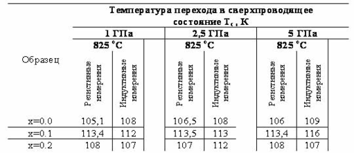 Таблица 1. Температура перехода в сверхпроводящее состояние образцов системы Tl2Ba2CaCu2O8-x/2Fx (где x=0; 0,1; 0,2)
