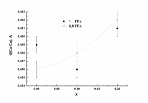 Рис.2 Зависимость расстояния d (Cu - Cu) от содержания фтора (x)