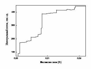 На рис.1 приведен фрагмент просуммированной величины всплесков, которая пропорциональна магнитному потоку, проникшему в образец. Видно, что наблюдаются случайные скачки потока разной амплитуды. На рис.2 приведена гистограмма распределения величины всплесков ЭДС индукции. Видно, что проникновение магнитного потока происходит в виде скачков, имеющих степенное распределение, что является прямым подтверждением существования самоорганизованного критического состояния в джозефсоновской среде.