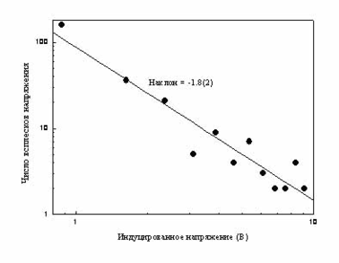 Численное изучение самоорганизованного критического состояния в различных моделях гранулярных сверхпроводников было проведено в ряде работ (см. например, [7]), где, в частности, было показано, что вероятностное распределение лавин магнитного потока по размерам имеет скейлинговый характер, характерный для самоорганизации, при этом в системе могут возникать гигантские "лавины", которые в нашем случае представляют собой мощные всплески напряжения в образце.