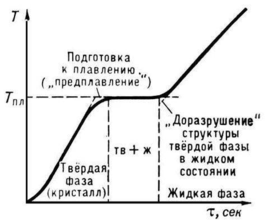 П. начинается при достижении кристаллическим веществом Тпл. С начала П. до его завершения температура вещества остаётся постоянной и равной Тпл, несмотря на сообщение веществу теплоты (рис. 2). Нагреть кристалл до Т > Тпл в обычных условиях не удаётся (см. Перегрев), тогда как при кристаллизации сравнительно легко достигается значительное переохлаждение расплава.