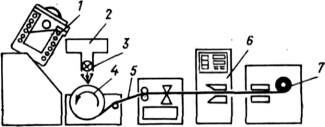 Схема установки для получения аморфных лент. 1 - индукционная печь для планки металла; 2 — резервуар для металла; 3 — дозировочный аппарат; 4 - вращающийся барабан; 5 - полученная и в течение 1 мс аморфная лента; 6 — контрольные приборы; 7 - намотка ленты на барабан.